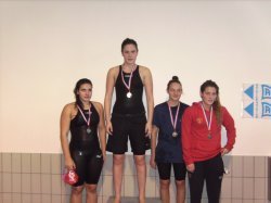 Ce week-end, à Bayonne , près de 300 nageurs étaient présents pour disputer les championnats d’Aquitaine en bassin de 25m. Six nageurs bergeracois étaient qualifiés et ont fait le déplacement. Eline Mathon devient championne d’Aquitaine sur 200m nage libre en explosant son record personnel en 2’12’’48 ; elle améliore aussi largement ses chronos en terminant 3ème sur 100m nage libre en 1’01’’44, sur 200m dos en 2’28’’ et 800m nage libre en 9’56’’, à noter égalment sa 4ème place sur 100m dos en 1’09’’07 (meilleur chrono). Les autres nageurs du groupe ne sont pas en restes puiqu’ils améliorent tous leur chronos personnels. Tristan Baillard 4ème sur 100m dos en 1’03’’85 et 5ème sur 200m dos. Roxane Gamot 1ère finale B du 100m 4 N en 1’13’’47, 5ème sur 200m 4 N en 2’38’’01. Maud Sanchez 3ème finale B 100m dos en 1’14’’35. Brice Mérillon 8ème sur 100m brasse en 1’13’’98, 3ème finale B 50m brasse en 33’’64, 6ème sur 200m brasse en 2’41’’ ainsi que Antoine Adjémian 8ème sur 200m brasse en 2’46’’.