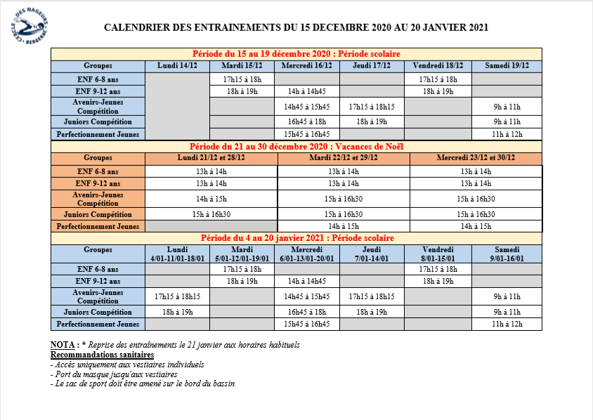 Vous trouverez en pièce jointe sur cette page et dans la rubrique "documents - Sportifs", les nouveaux horaires en période scolaire et pour les vacances de Noël.
